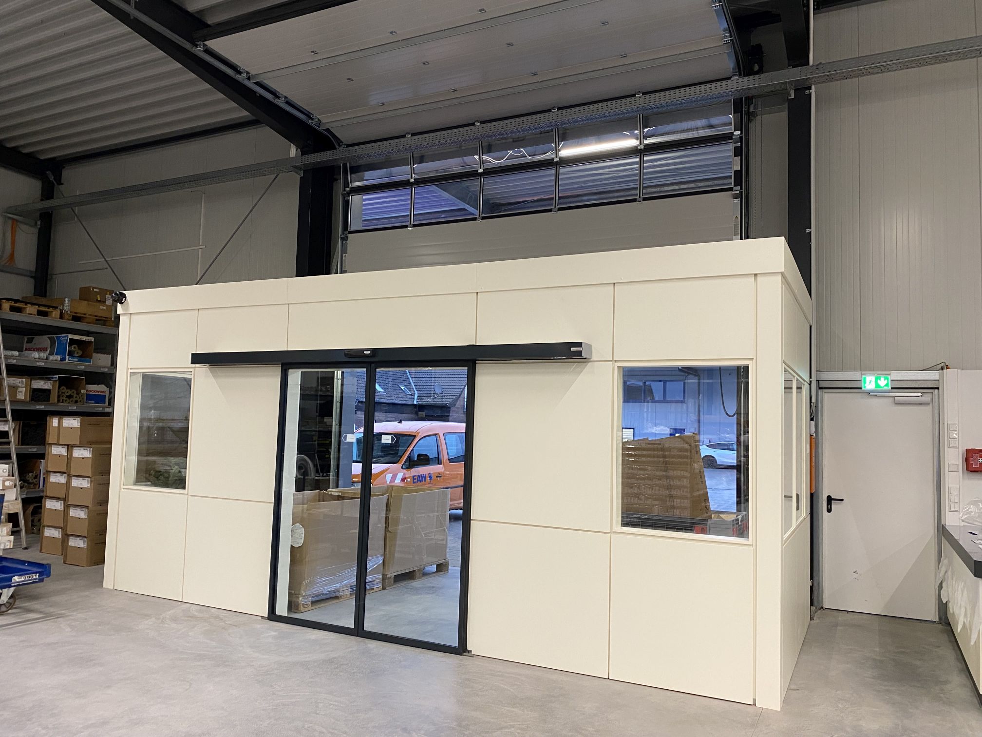 Stahlkonstruktion, Dachtrapezblech, Dachdichtung und Entwässerung, Thermowandfassade, Dachlichtband einschl. RWA, Fenster, Tor und Tür